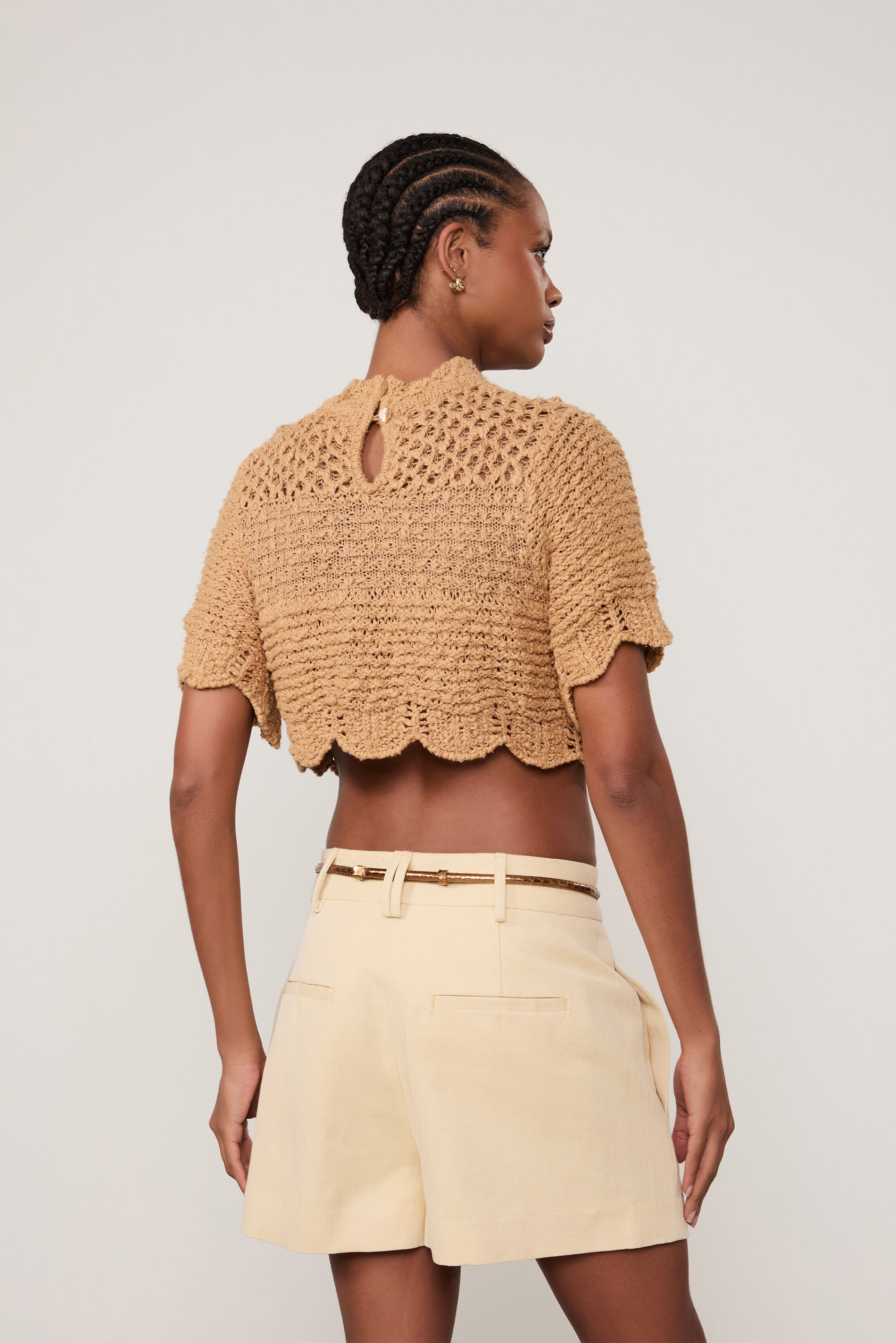 Blusa De Tricot Cropped Ponto Rústico Babados