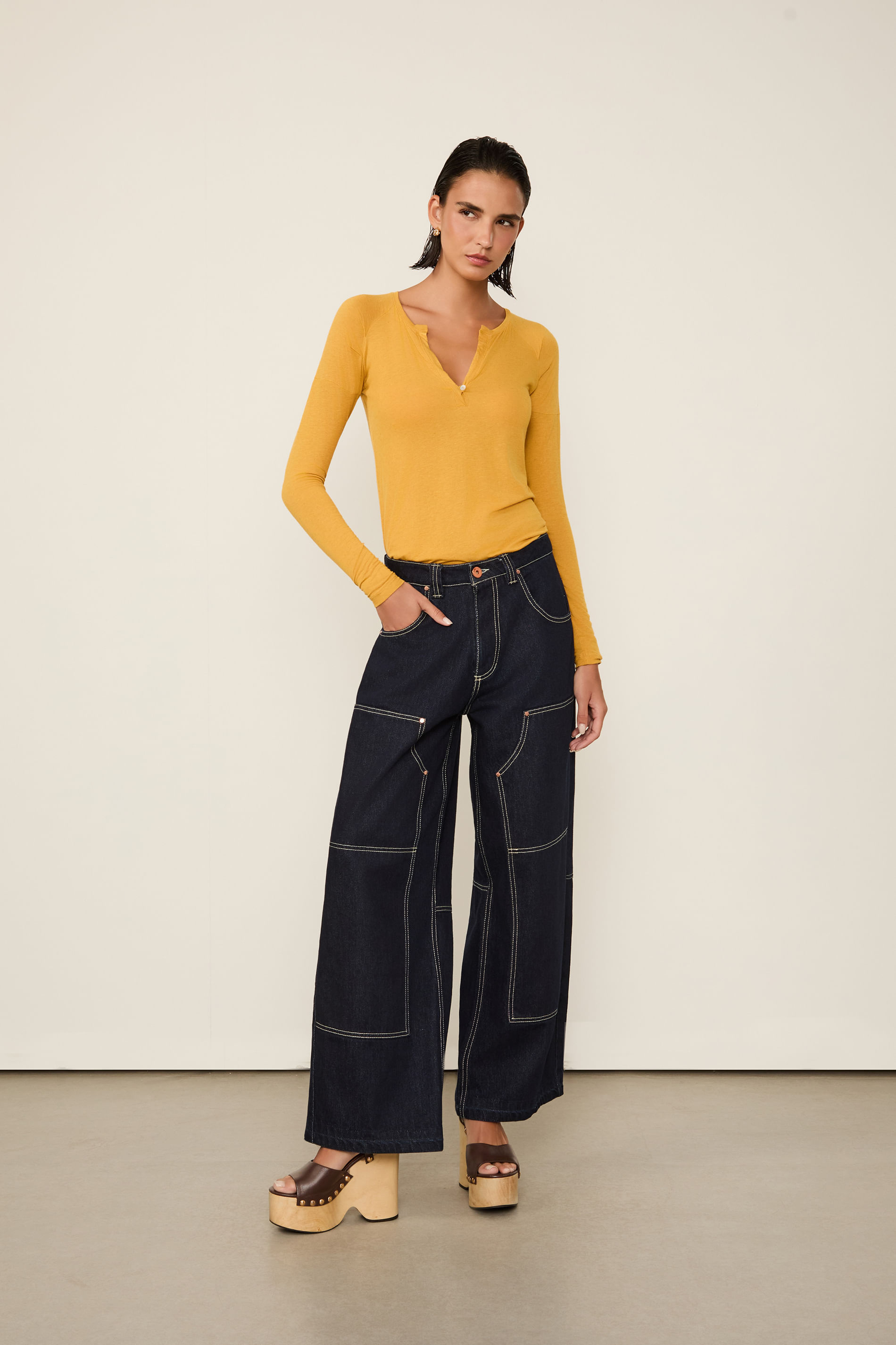 - Decote em V;
