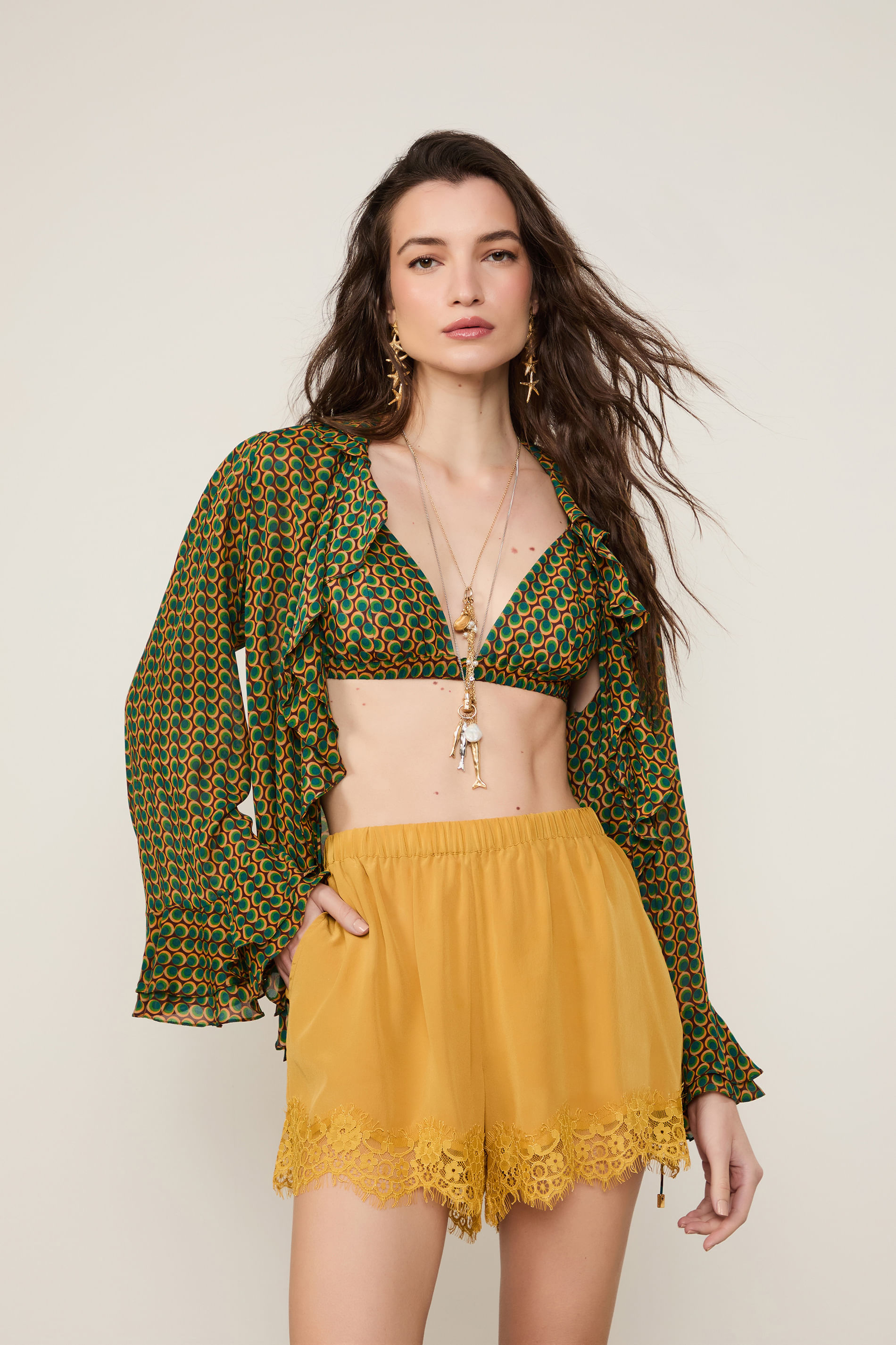 Short De Georgette Caramelo Solar Com Detalhe De Renda