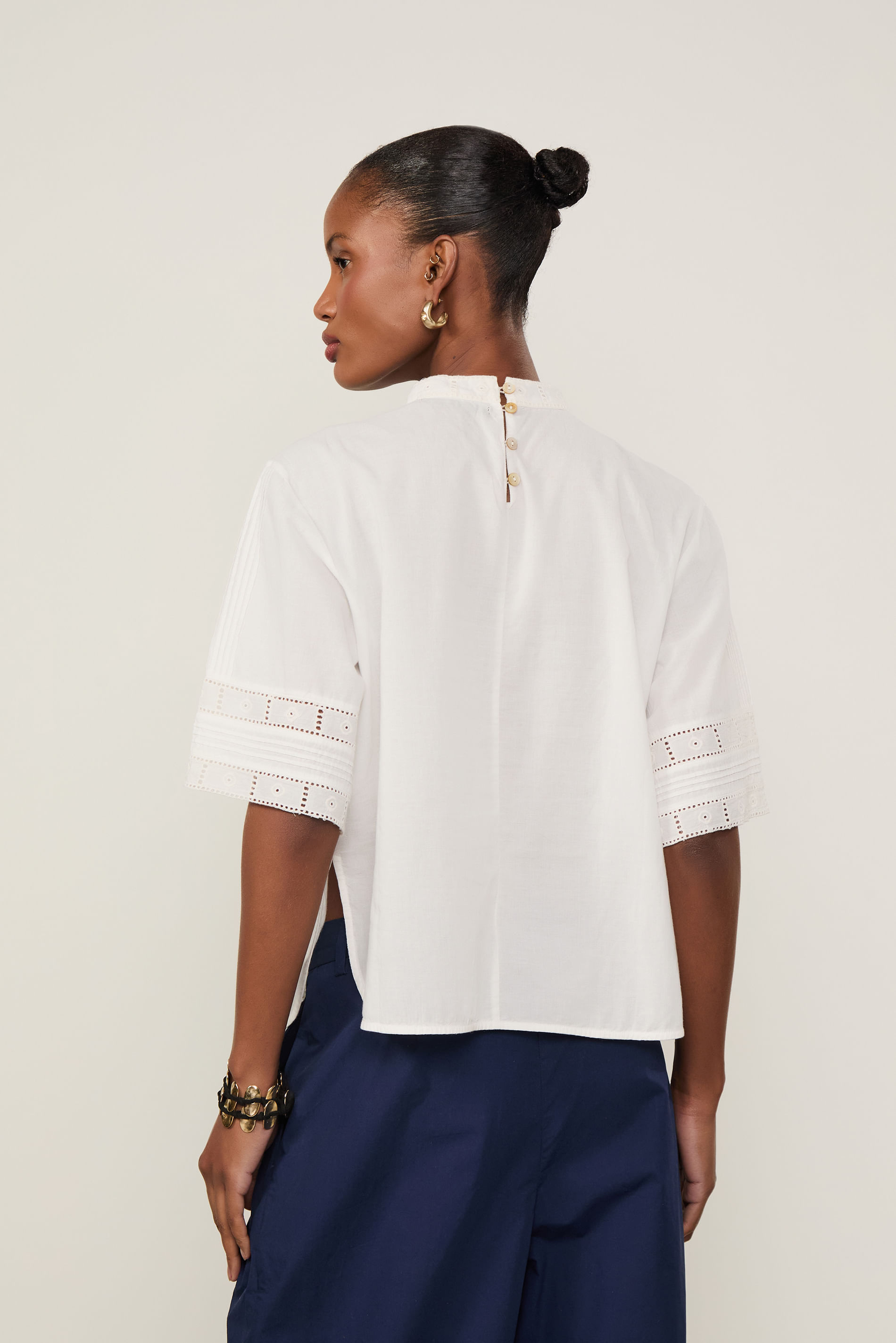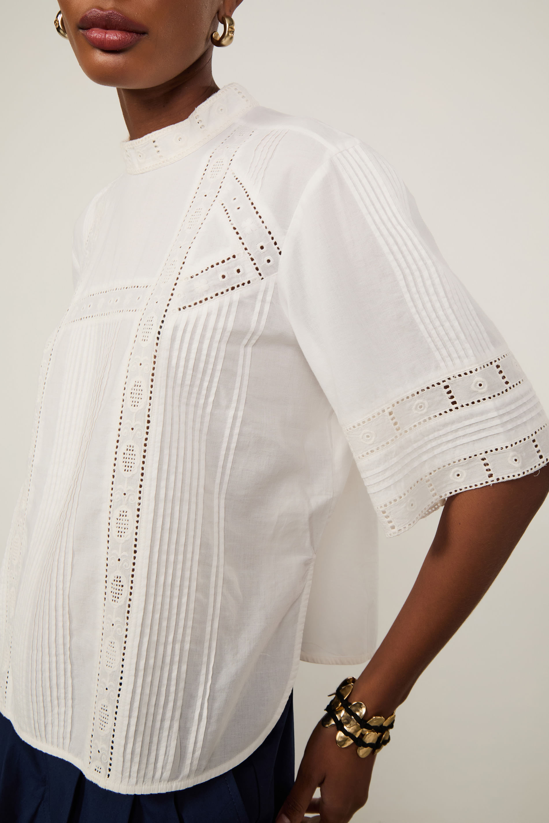 T-Shirt De Voil De Algodão Manga Curta Detalhe Rendas e Nervuras Off White