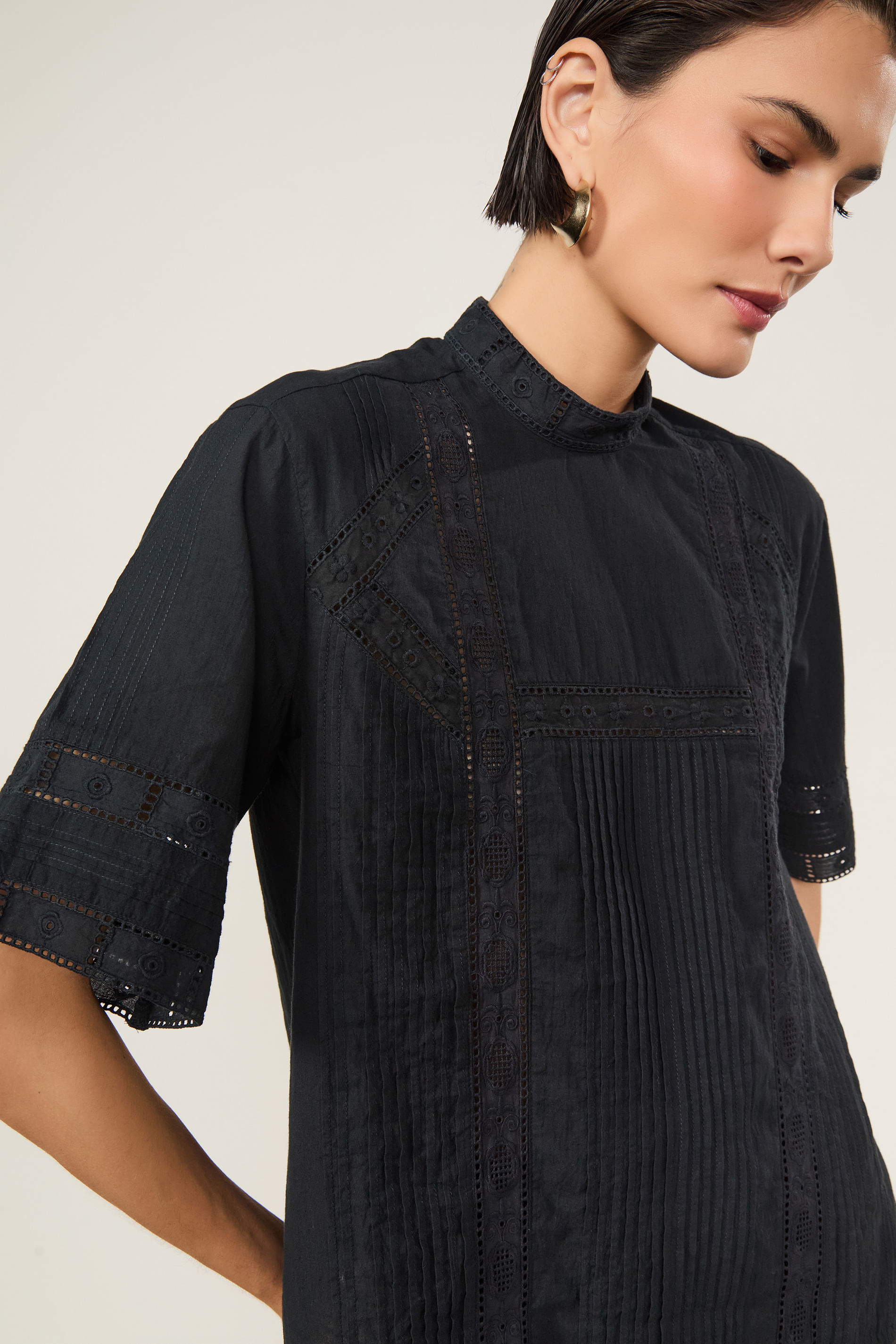 T-Shirt De Voil De Algodão Manga Curta Detalhe Rendas e Nervuras Off White