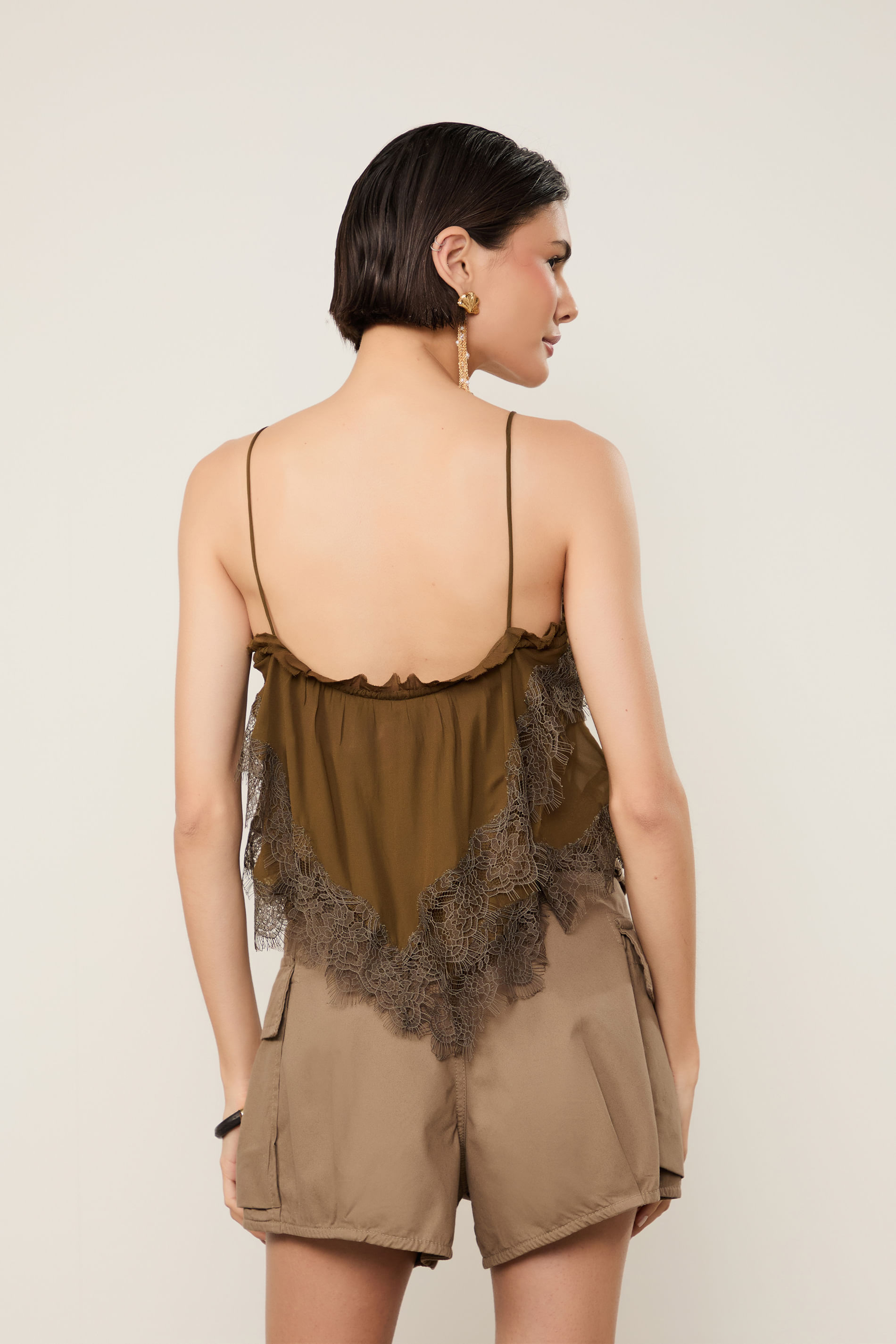 Top De Georgette Leve Marrom Renda Aplicada