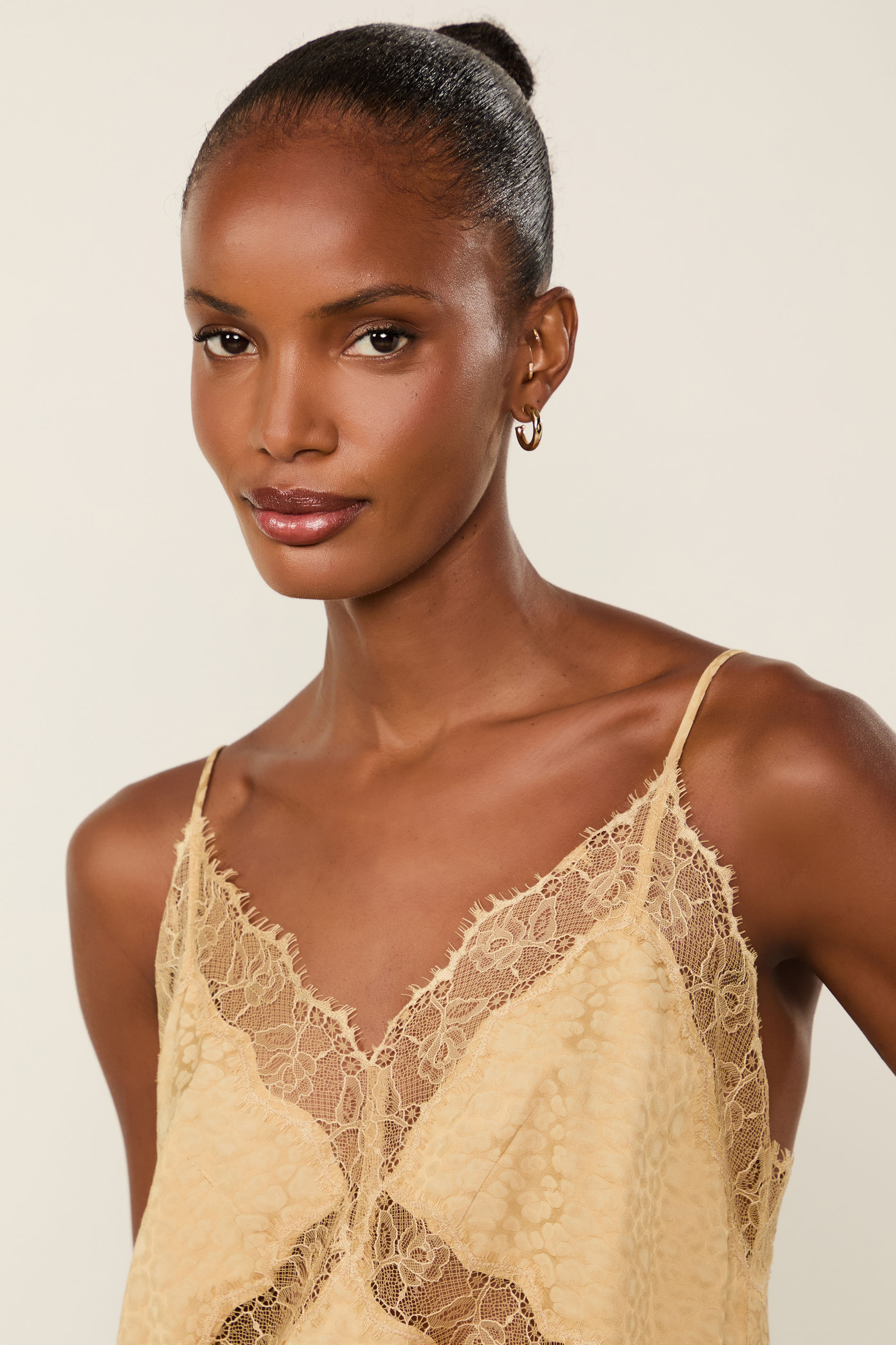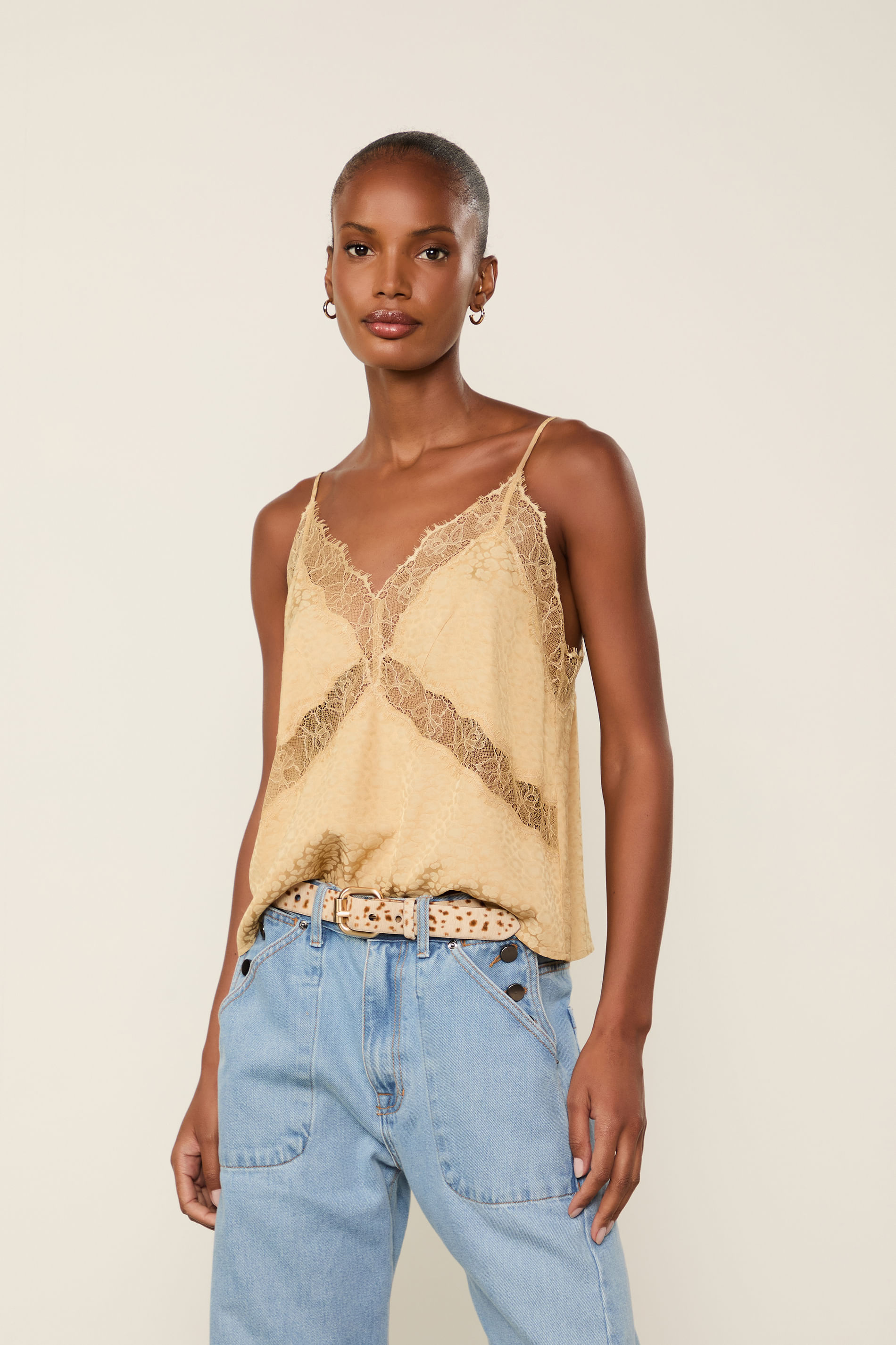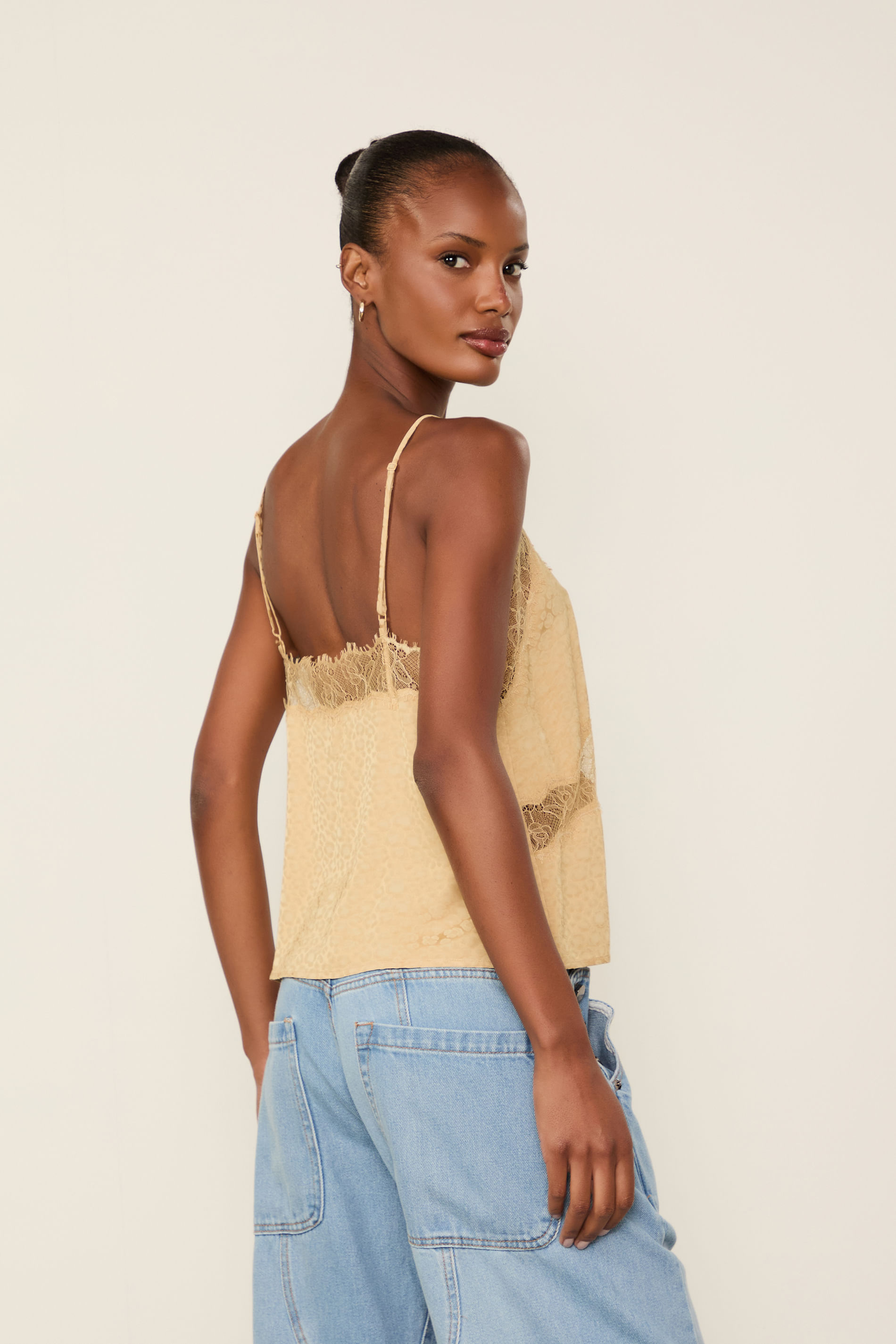 Top De Jacquard De Alça Bege Pret Com Aplicações De Renda
