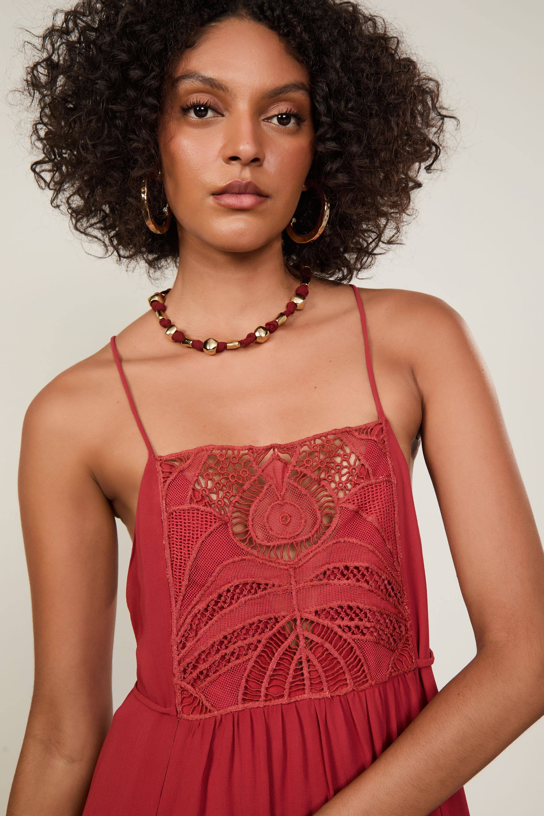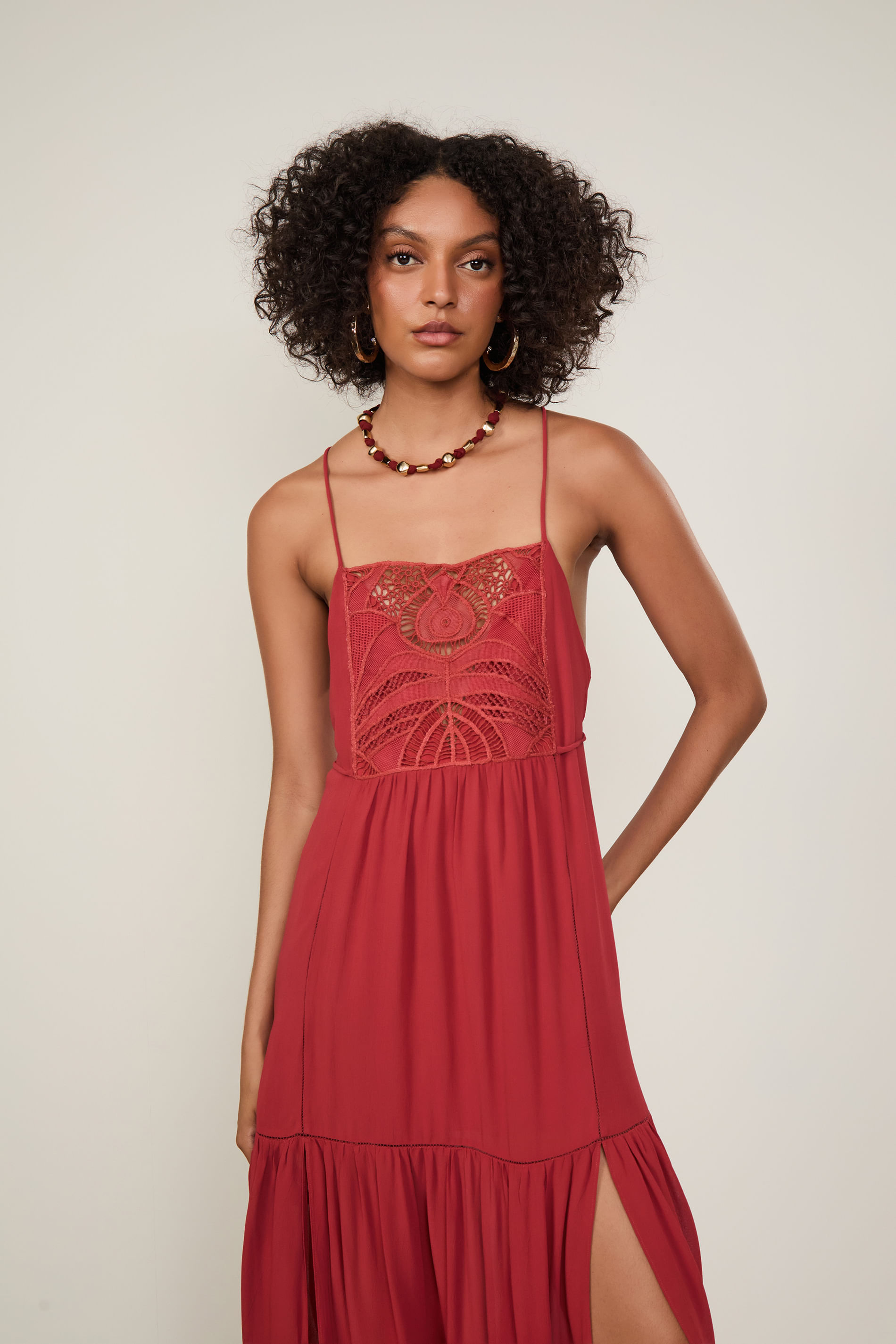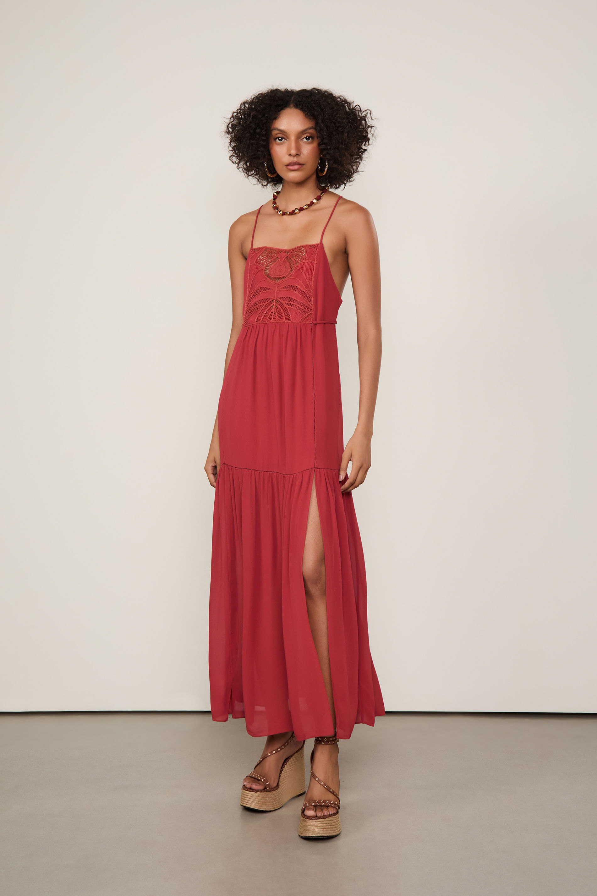 Vestido Midi com alças, decote reto, saia evasê com barrado rodado, detalhe de entremeios, fenda na barra, amarração regulável nas costas e pala de renda no busto. Uma proposta fluida e feminina.