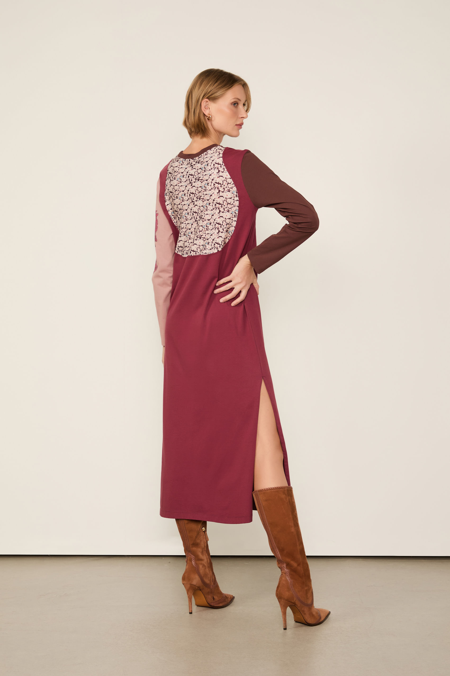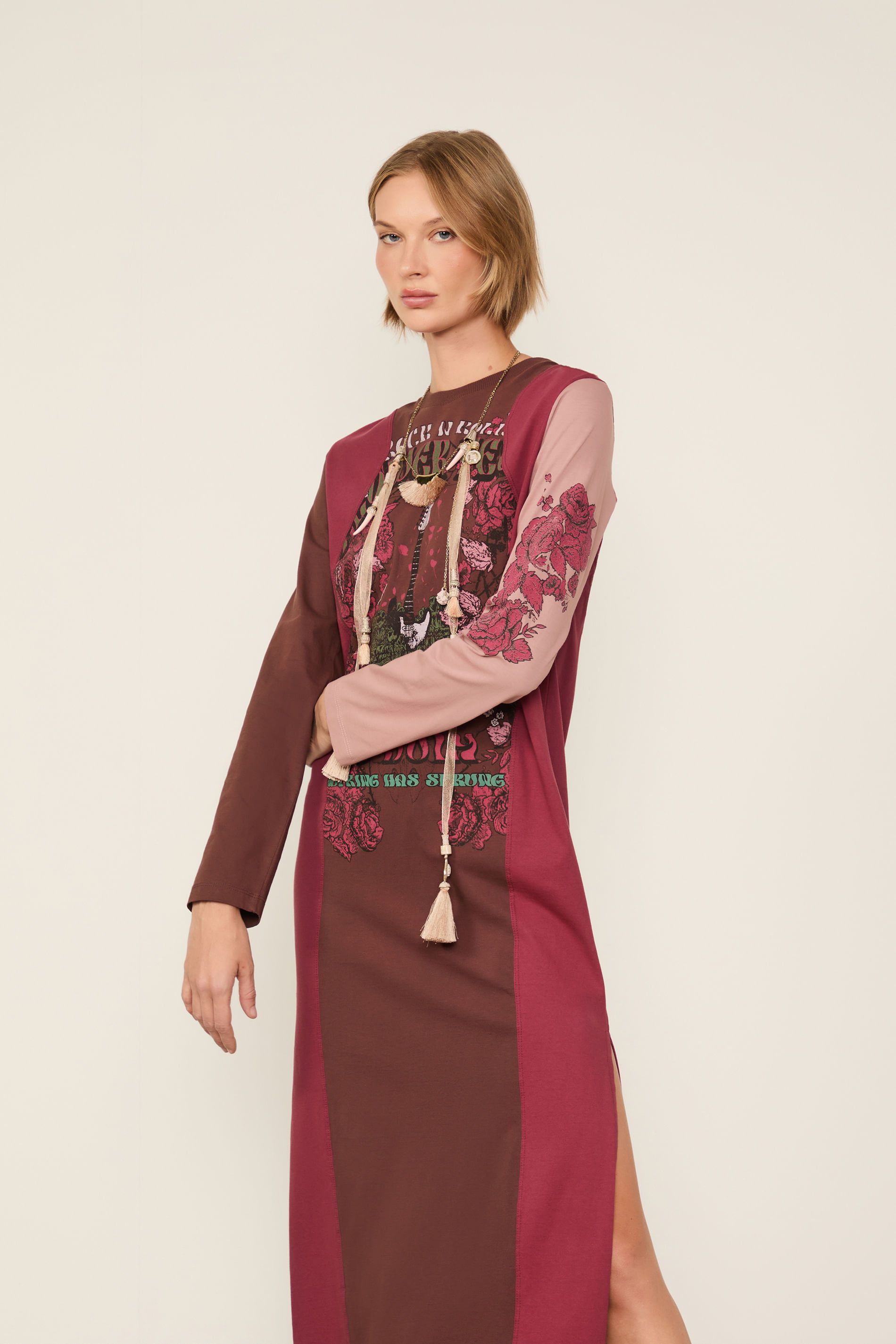 Vestido De Malha Fun Com Fenda Marrom e Vermelho